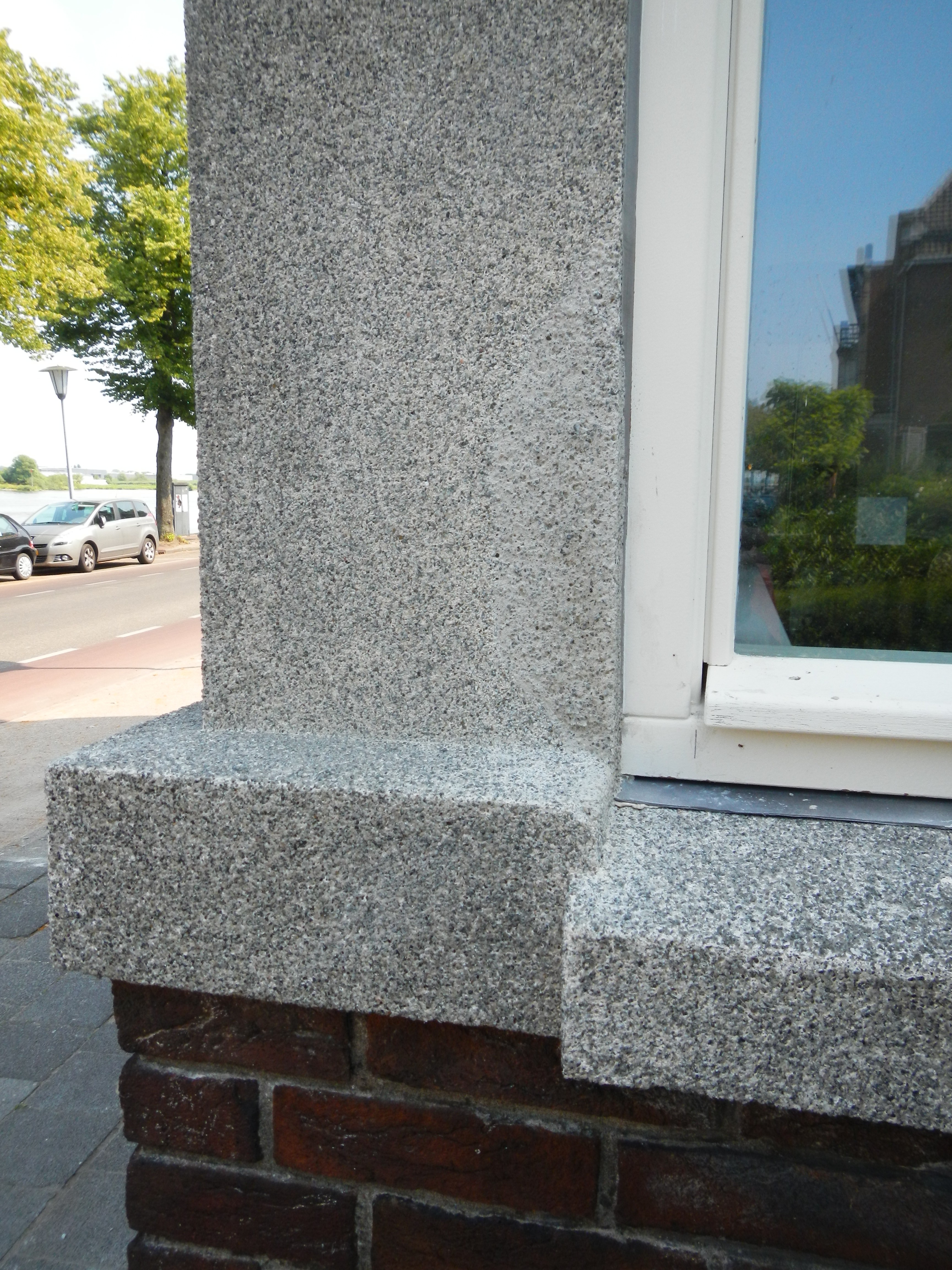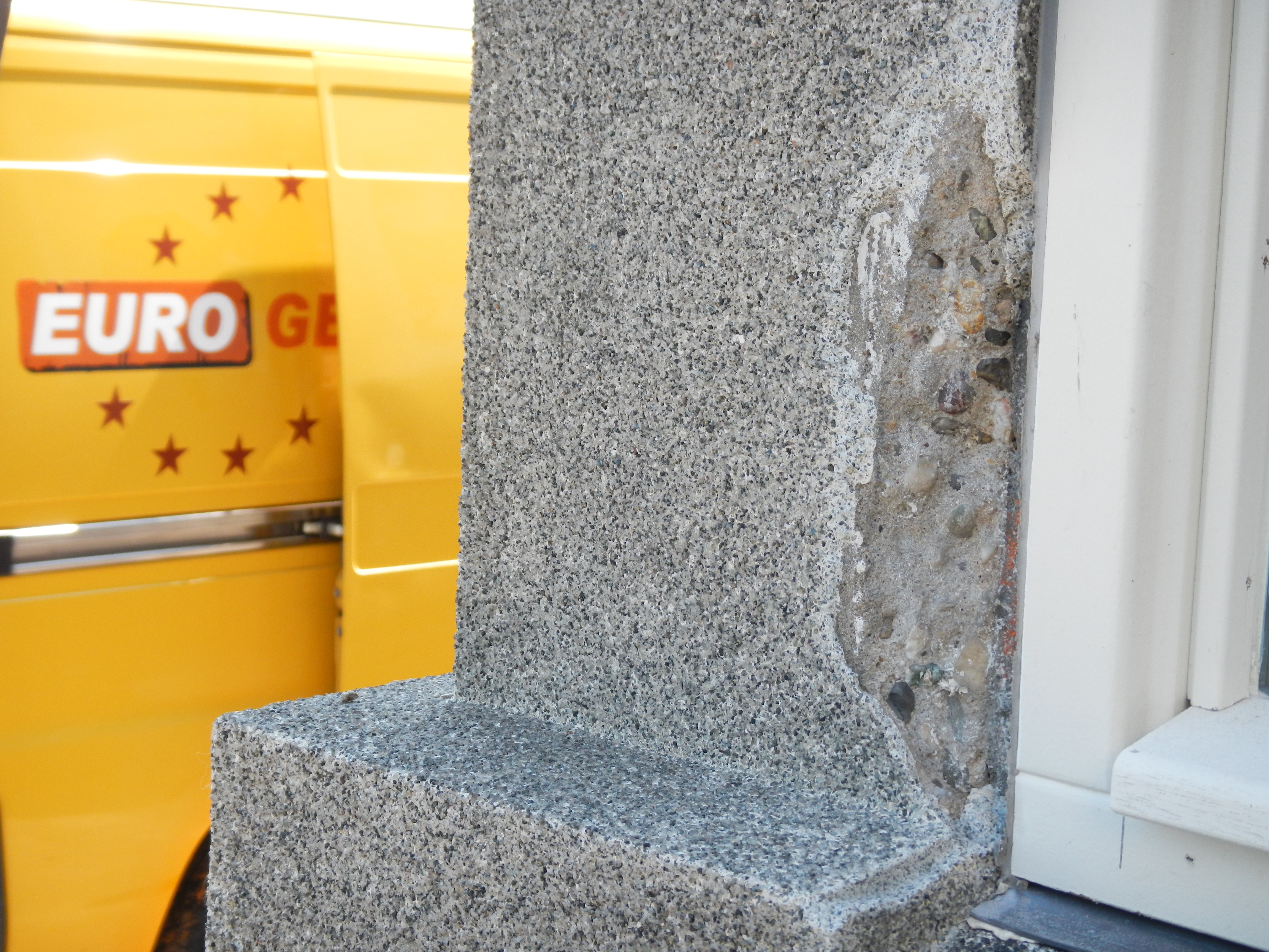 Betreffende ondergrond is bijna 100 jaar oud. De specifieke uitstraling is niet in een standaard reparatie mortel te verkrijgen. Als basis is gebruik gemaakt van de Betofix RM van Remmers bouwchemie. De specifieke uitstraling is verkregen door het toepassen van een specifiek uitgezochte grind korrel ten einde een uitstraling te verkrijgen welke als veel als mogelijk overeenkomt met het origineel.